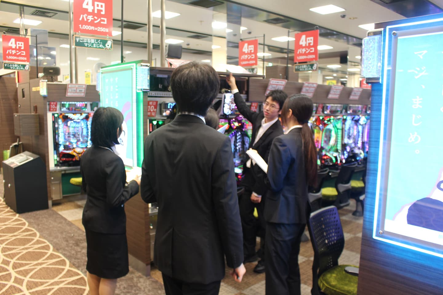 店舗配属後は、先輩スタッフの指導の下、一つひとつ業務・接客のポイントを身につけていきます。機械の操作など覚えることが多いため、進捗を確認しながらステップアップをしていきます。3ヶ月~半年をかけて、パチンコ・スロット、カウンター、その他業務と、一通りの業務を習得します。業務知識・技術の他にも、風適法や遊技台など、関連する知識強化の勉強会や、毎月の接客向上の取り組みも行っています。